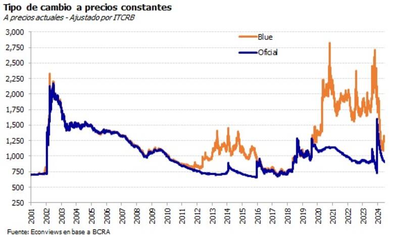 De todos modos, al analizar estos valores en términos reales (al ajustar por inflación tanto local como internacional), el blue se encuentra lejos de otras crisis recientes. Por ejemplo, los $1100 que alcanzó en octubre del año pasado, son equivalentes a $2700 actuales. Mientras que los $195 de octubre de 2020, serían $2800 de hoy, de acuerdo con un análisis de Econviews.