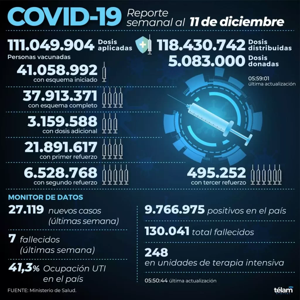 Según informó a cartera sanitaria, este domingo se reportaron 7 muertes por coronavirus y 27.119 contagios en la última semana en la Argentina, lo que representa un 115% más de casos que el domingo pasado (12.609).