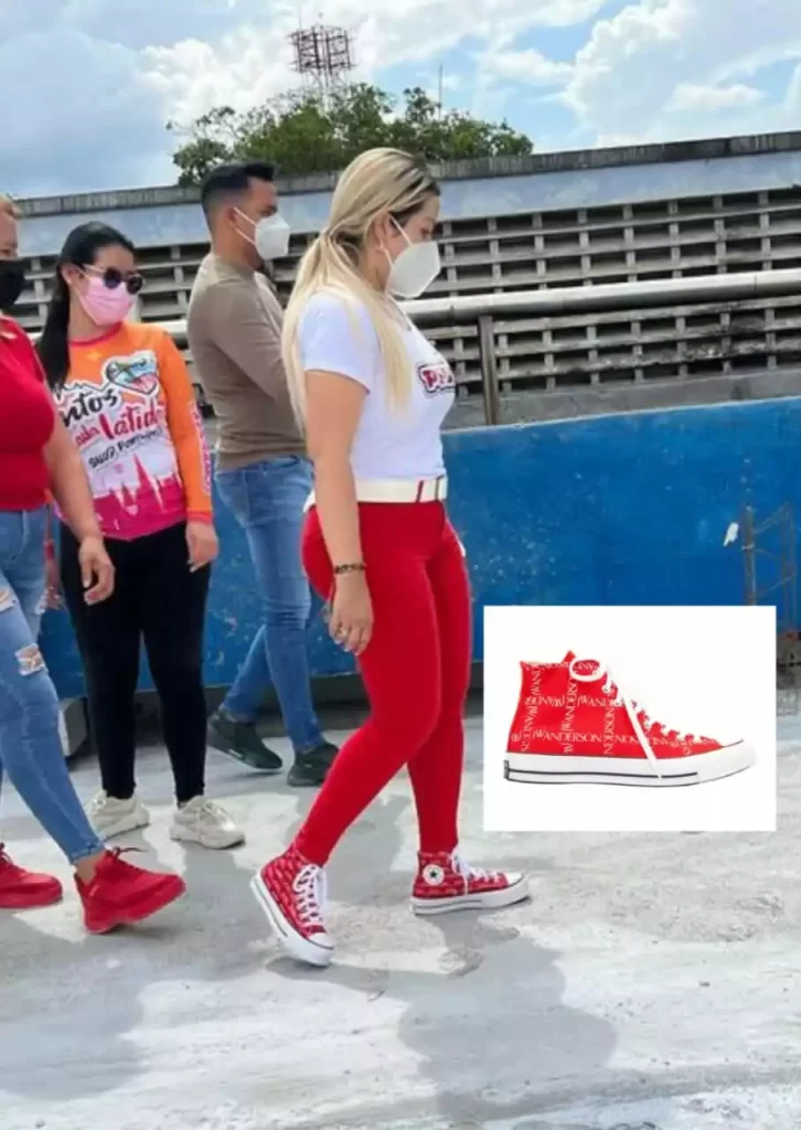 Por supuesto que los clásicos Convers no faltan en el armario de la primera combatiente, como también se hace llamar. Este modelo de la conocida marca es un poco más llamativo y ella los prefirió rojo, tienen un valor de 69 dólares y los combinó con una franela del PSUV.
