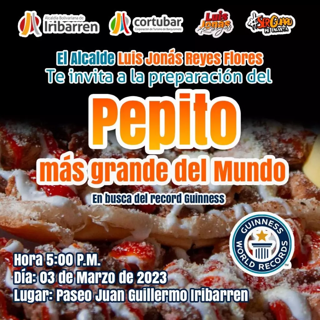 Desde Barquisimeto, capital del estado Lara, se buscará romper un Récord Guinnes con la preparación del pepito más grande del mundo, con una meta de 120 metros, informó el alcalde del municipio Iribarren, Luis Jonás Reyes.