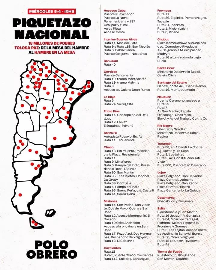 En la previa del fin de semana largo por Semana Santa, las protestas vuelven a las calles este miércoles con un nuevo «piquetazo nacional» que incluirá cortes de acceso a la Ciudad de Buenos Aires y de rutas en varios puntos del país.