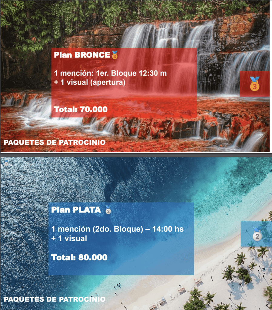 De acuerdo a la propuesta que les hicieron llegar, hay cuatro planes para ser «sponsor»: el primero es el plan bronce, el cual cuenta con una sola mención que sería en el primer bloque del evento a las 12:30 del mediodía, es decir, 30 minutos después del inicio, el mismo tiene un valor de 70 mil pesos o 175 dólares.
