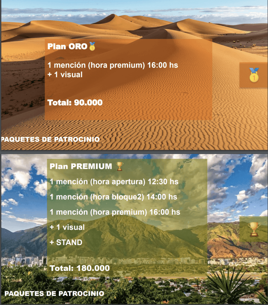 Y el Plan Premium, que es el más completo y con una mayor inversión incluye tres menciones: a las 12; 14 y 16 horas más una visual más un stand, no indica la ubicación, por 180 mil pesos o 450 dólares.