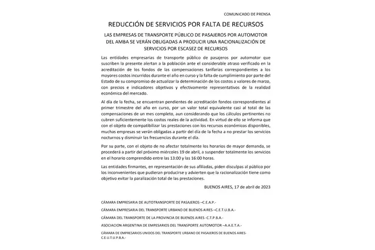 La medida fue anunciada el lunes pasado a través de un comunicado oficial titulado: “Reducción de servicios por falta de recursos”, que fue firmado por la Cámara Empresaria de Autotransporte de Pasajeros (CEAP), la Cámara Empresarial del Transporte Urbano de Buenos Aires (Cetuba), la Cámara del Transporte de la Provincia de Buenos Aires (Ctpba), la Asociación Argentina de Empresarios del Transporte Automotor (Aaeta) y la Cámara de Empresarios Unidos del Transporte Urbano de Pasajeros de Buenos Aires (Ceutupba).