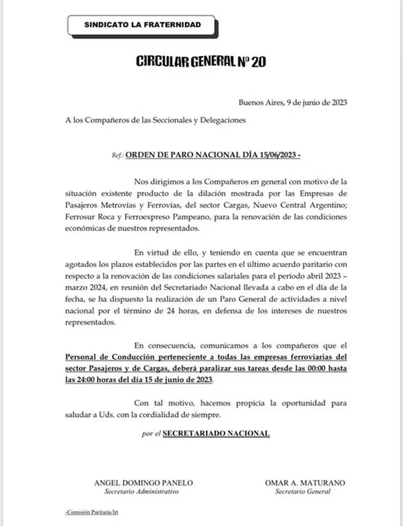 “Teniendo en cuenta que se encuentran agotados los plazos establecidos por las partes en el último acuerdo paritario con respecto a la renovación de las condiciones salariales para el período abril 2023-marzo 2024 se ha dispuesto la realización de un paro general de actividades a nivel nacional por el término de 24 horas», afirmaron en el documento, que lleva la firma de Maturano y el secretario administrativo, Ángel Panelo.