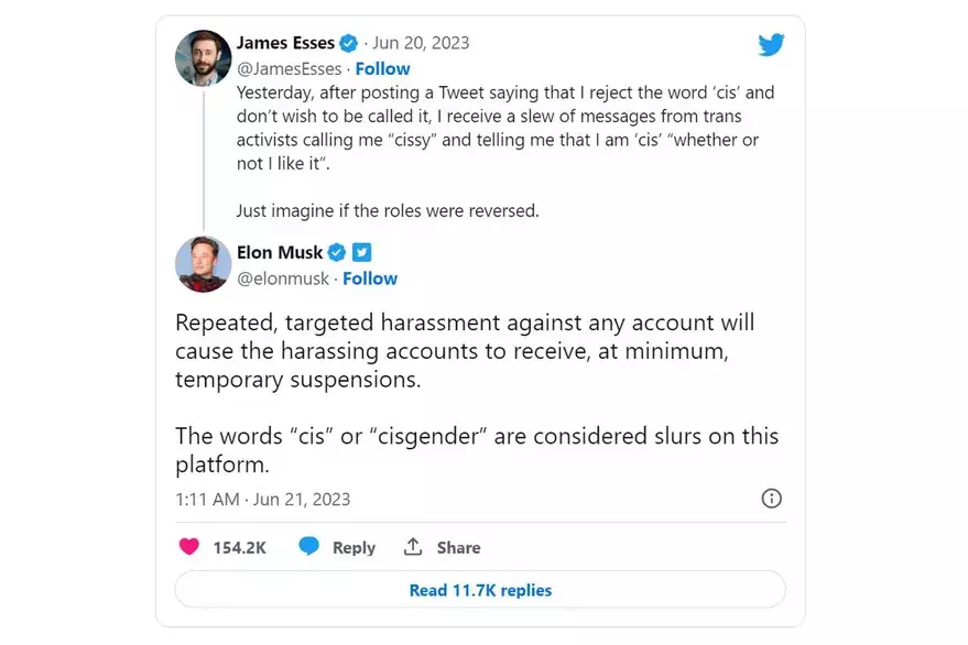 Y el comentario de Elon Musk es una respuesta a otro tuit, de James Esses, en el que afirmó. “Ayer, después de publicar un tweet diciendo que rechazo la palabra ‘cis’ y no deseo que me llamen así, recibí una gran cantidad de mensajes de activistas trans llamándome “cissy” y diciéndome que soy ‘cis’ “me guste o no”. Imagínense si los papeles se invirtieran.”