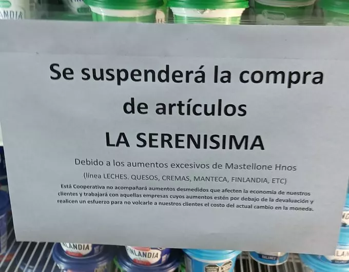 Según puede leerse en las notificaciones del comercio ubicado en 25 y 40, a metros del Parque Alberti, se argumenta la medida a partir de «los aumentos excesivos de Mastellone Hnos, la empresa dueña de la marca La Serenísima».