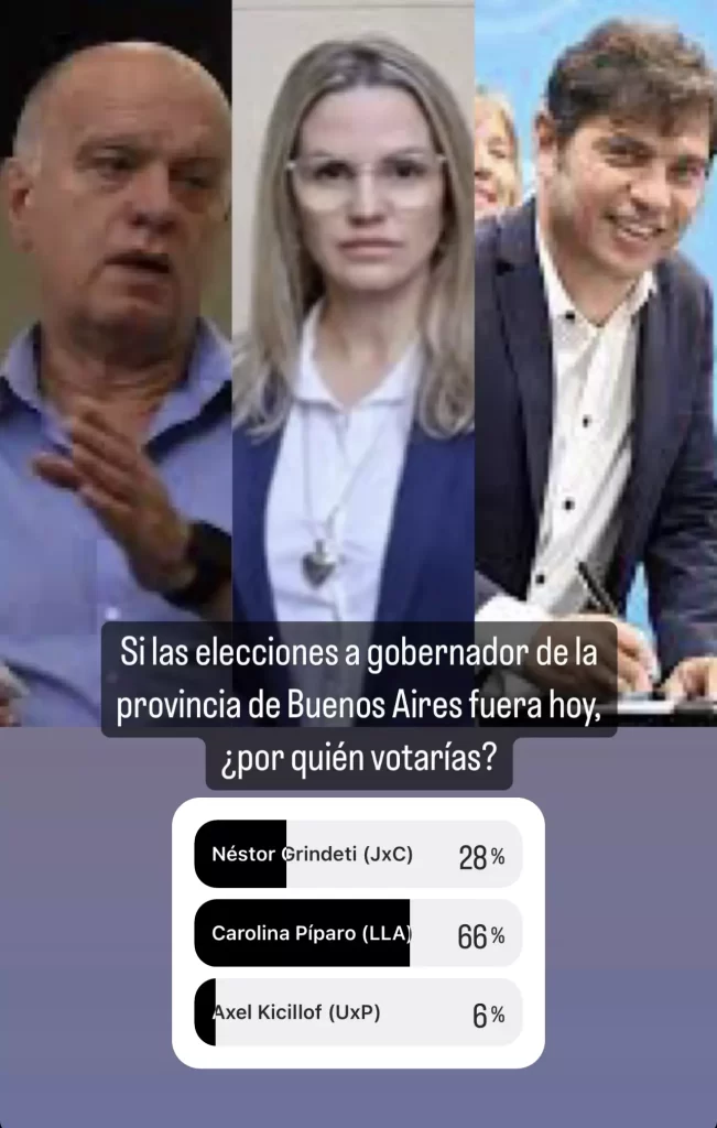 Entre tanto, a Gobernador(a) de la provincia de Buenos Aires, la balanza se inclino hacia Carolina Píparo de La Libertad Avanza, con 66 %, seguida de Néstor Grindetti de Juntos por el Cambio con 28 % y finalmente, el actual gobernador Axel Kiciloff con 6 %.