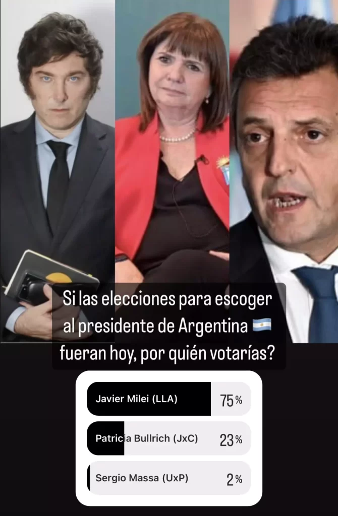 Para Presidente de Argentina, Javier Milei de La Libertad Avanza siguió de primero con 75 % de favoritismo frente a 23 % que apoya a Patricia Bullrich y sólo el 2 % lo haría por Sergio Massa.