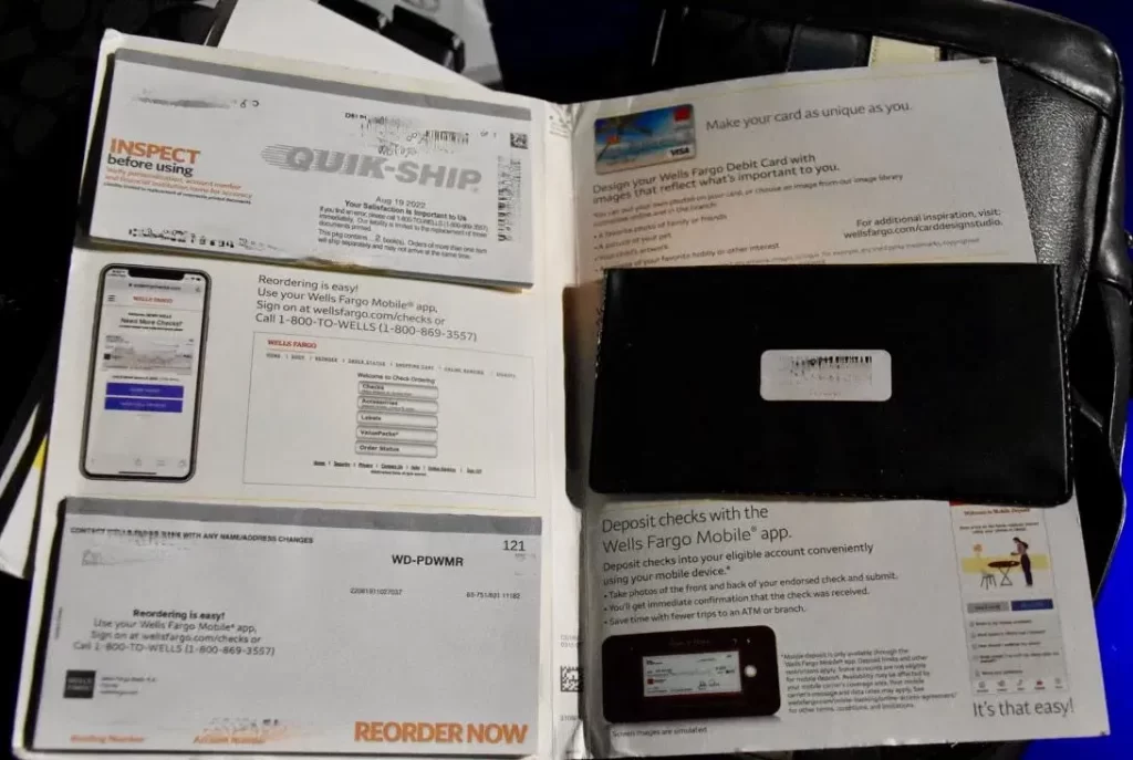 Los investigadores también encontraron tarjetas de crédito robadas, giros postales falsos, cheques en blanco y otras pruebas de fraude bancario en su automóvil.