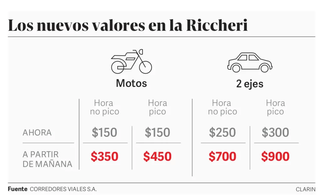 De esa manera, el peaje en horario normal para una moto en la estación Riccheri pasará a valer $ 350 mientras que ahora cuesta $ 150. En horario pico, mientras tanto, pasará a $ 450.