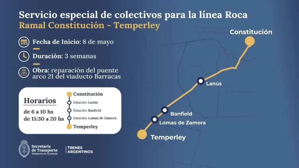 Los autobuses especiales, que unen Constitución – Temperley, funcionan entre las 6 y las 10 de la mañana y desde las 15:30 a las 20, con paradas intermedias en las estaciones de Lanús, Lomas de Zamora y Banfield.