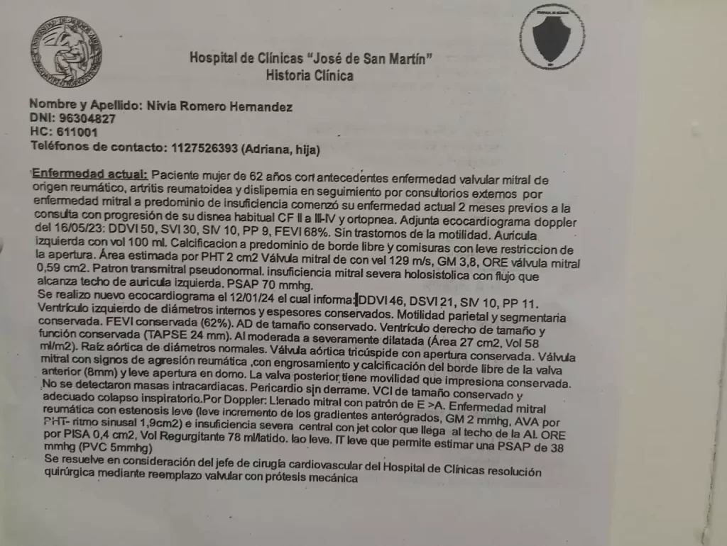 Nivia Romero, de 62 años de edad, requiere una válvula mitral para que su corazón siga latiendo, debido a que la suya, no elastiza. Su hija Frannis Pérez, cuenta que cada semana deben ir a la emergencia del Hospital Argerich de Buenos Aires cuando su propia válvula se le cierra y no la deja respirar, por lo que la sangre pasa a los pulmones y los médicos hacen maniobras para evitar un paro respiratorio.