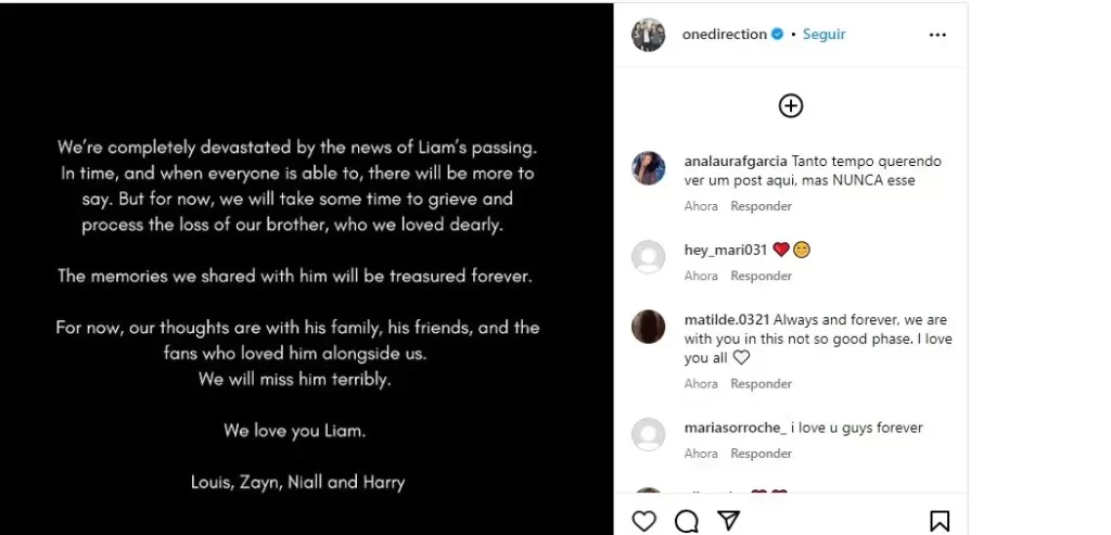 Los músicos Harry Styles, Louis Tomlinson, Zayn Malik y Niall Horan, quienes junto a Payne formaron la icónica banda que marcó a toda una generación, concluyeron con un emotivo mensaje: «Te extrañaremos terriblemente. Te amamos, Liam«.