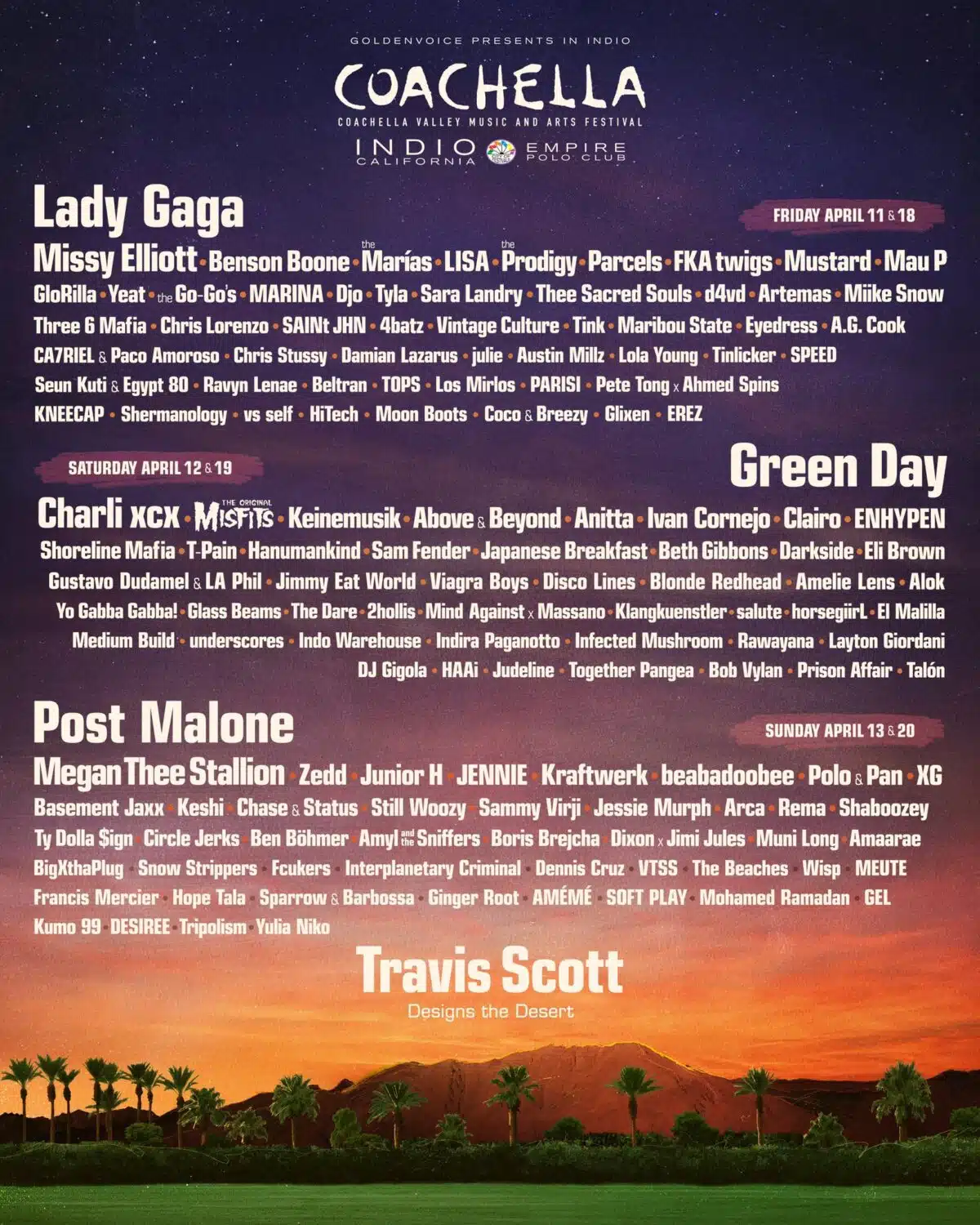 Las grandes estrellas que encabezan esta edición del festival son Lady Gaga, Green Day y Post Malone, mientras que Travis Scott figura como el artista especial de 2025. El cartel incluye también actuaciones de nombres destacados como Charli XCX, la icónica Missy Elliott, la rapera Megan Thee Stallion, la cantante tailandesa Lisa, la legendaria banda de punk The Misfits y la cantautora estadounidense Clairo.