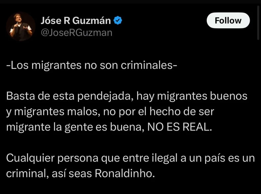 El comediante José Rafael Guzmán ES RE VIRAL en las redes sociales, luego que días atrás lanzará un tuit en el que afirmó que «no por el hecho de ser migrante la gente es buena, NO ES REAL. Cualquier persona que entre ilegal a un país es un criminal, así seas Ronaldinho», escribió en la red social X, por lo que sus seguidores reaccionaron con una batería de comentarios en contra de su comentario, otros lo apoyaron.
