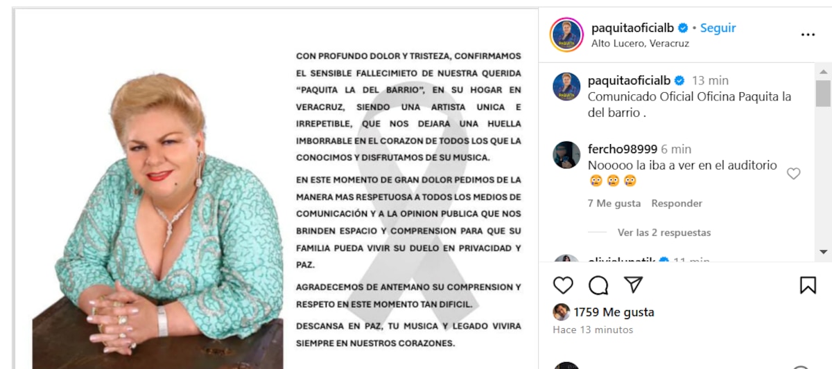 La noticia fue confirmada a través de sus redes sociales, donde se informó que la artista murió en su hogar en Veracruz.