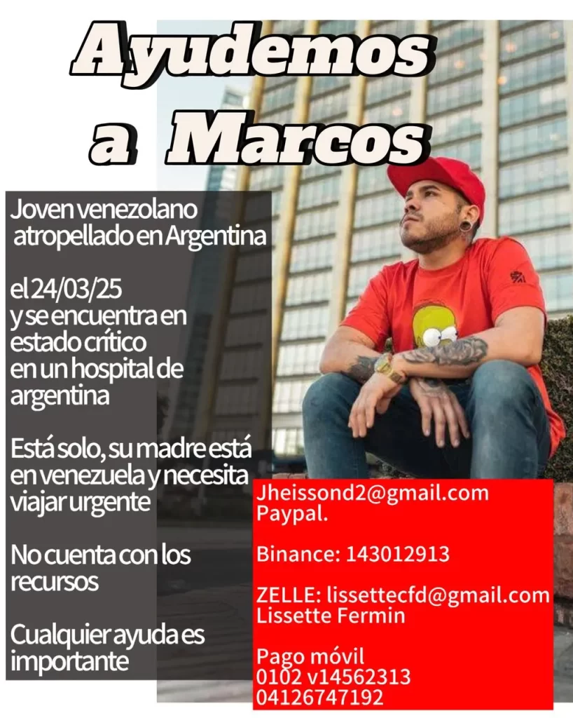 Marcos Javier Torrealba Marín, de 28 años de edad, fue atropellado el pasado el pasado 24 de marzo, cuando a primera hora del día se encontraba en la provincia González Catán de Argentina y esperaba el transporte para ir a su trabajo como sushi man, pero un hombre que manejaba a exceso de velocidad y presuntamente bajo efectos de alcohol, lo atropelló. «Estaba esperando el Didi para irse, estando en la parada, el auto iba como desbocado, se montó por la acera y se lo llevó por delante a él y a una señora, quien sufrió sólo hematomas pero a él le dio de frente», informó Lorena, la madre de la víctima.