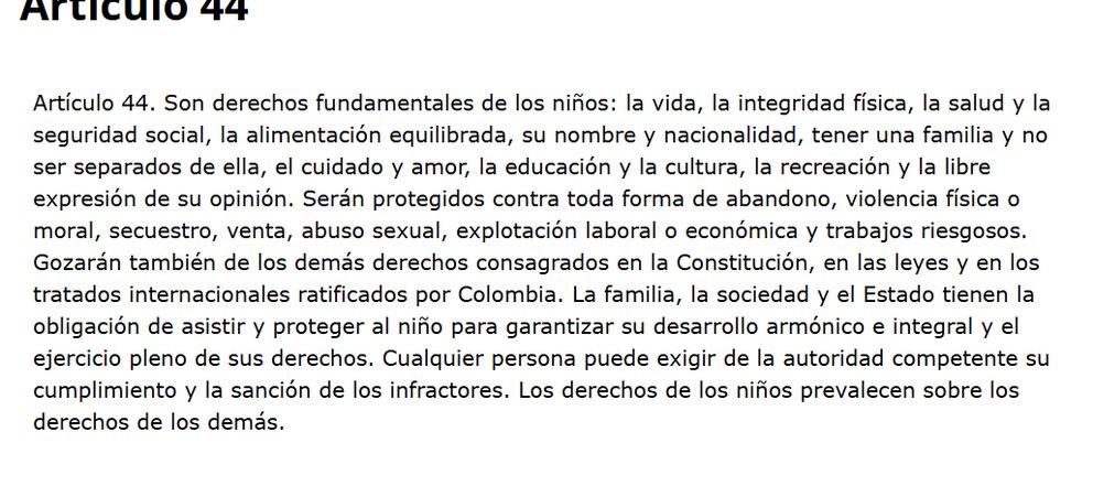 “Serán protegidos contra toda forma de abandono, violencia física o moral, secuestro, venta, abuso sexual, explotación laboral o económica y trabajos riesgosos”, reza el artículo. Además, gozan de todos los derechos reconocidos en la Constitución, la ley y los tratados internacionales ratificados por Colombia.
