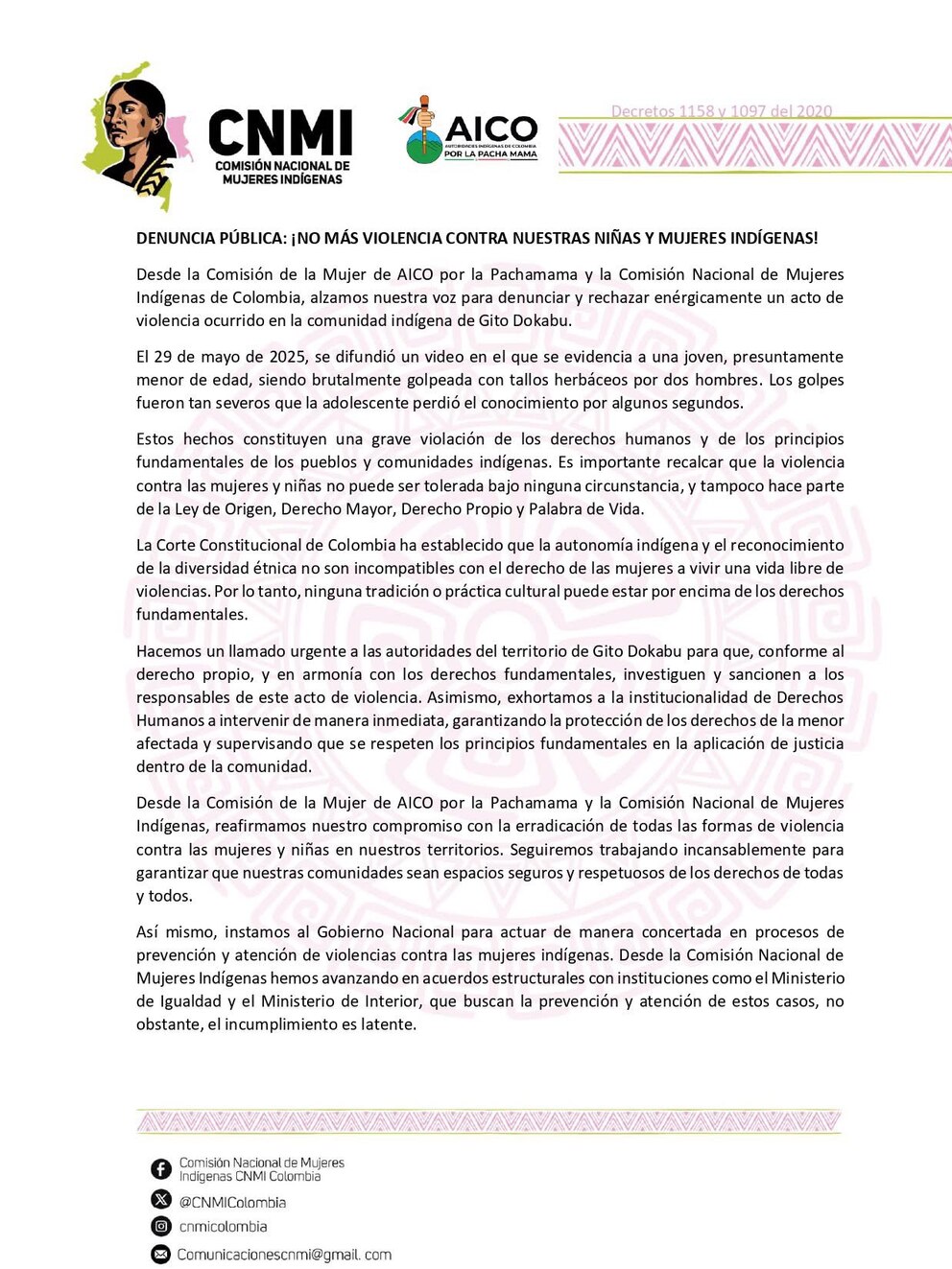 La Comisión Nacional de Mujeres Indígenas de Colombia y la Comisión de la Mujer de Aico por la Pachamama emitieron un comunicado conjunto condenando enérgicamente lo ocurrido. En su pronunciamiento recalcaron que este tipo de actos no solo atentan contra los derechos fundamentales de mujeres y niñas, sino que también contradicen los valores espirituales, culturales y políticos de los pueblos indígenas.