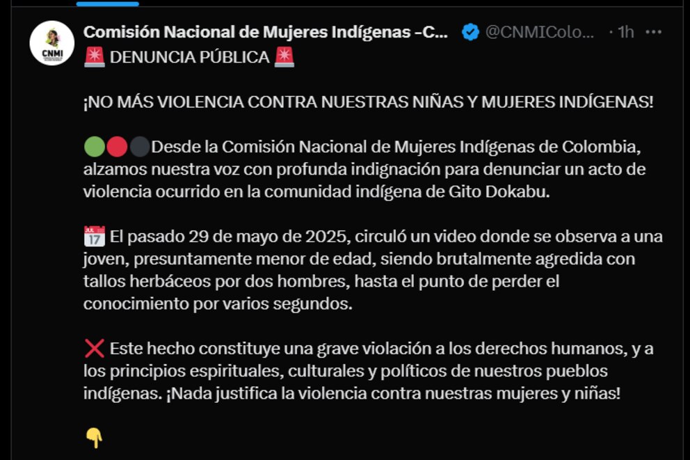 Un video que muestra un acto de violencia extrema contra una niña en la comunidad indígena de Gito Dokabu, en Risaralda, ha generado una ola de indignación en redes sociales y fue duramente condenado por organizaciones defensoras de los derechos de las mujeres indígenas en Colombia.