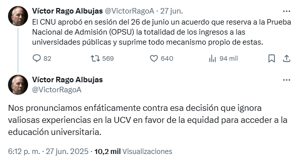 El rector de la Universidad Central de Venezuela (UCV), Víctor Rago, expresó su preocupación a través de su cuenta en X, señalando que la eliminación de estas evaluaciones ignora las experiencias internas orientadas a garantizar la equidad en el acceso desarrolladas por las universidades.