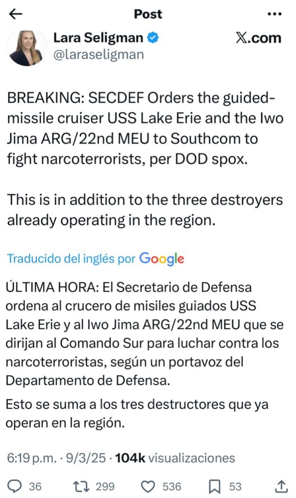 El Secretario de Defensa de Estados Unidos, Pete Hegseth, ordenó al crucero de misiles guiados USS Lake Erie y al Iwo Jima ARG/22nd MEU dirigirse al Comando Sur para combatir a los llamados “narcoterroristas”.