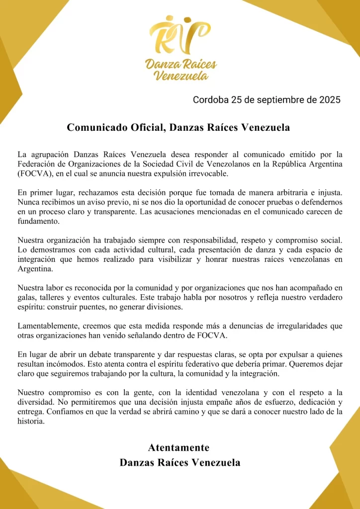 Lea también: Tras cinco renuncias, ahora FOCVA expulsó a una escuela venezolana de danza de Córdoba