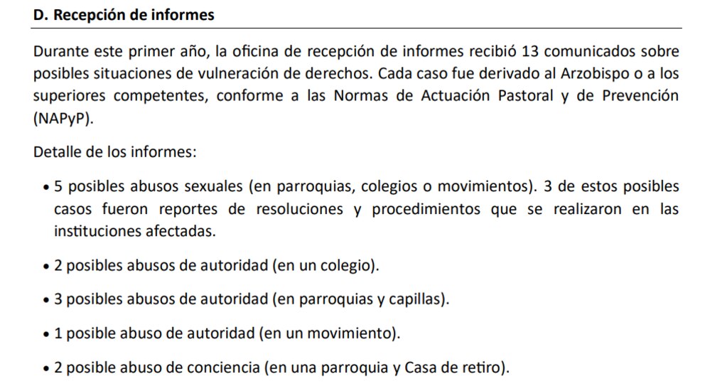 Según el reporte, durante su primer año de funcionamiento, la Oficina de Recepción de Informes registró 13 denuncias por distintos tipos de abusos ocurridos en parroquias, capillas, colegios, movimientos religiosos y casas de retiro de la provincia.