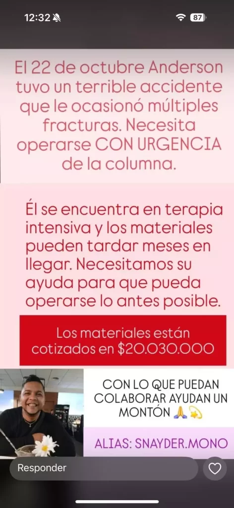 De acuerdo con sus familiares y allegados, Anderson necesita ser operado de urgencia debido a un desplazamiento en la columna vertebral, una lesión que lo expone a un alto riesgo de quedar cuadripléjico si no recibe la intervención quirúrgica a tiempo.