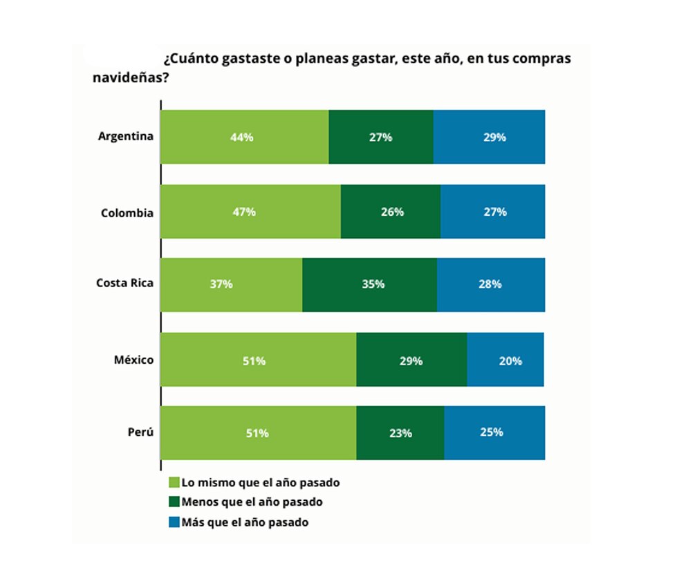 Esta percepción influyó directamente en la intención de gasto navideño. En Argentina, el 40% de los consumidores declaró haber gastado lo mismo que el año anterior, mientras que el 34% afirmó haber reducido su presupuesto, el porcentaje más alto entre los países analizados. En Colombia también se registró un ajuste del gasto, aunque en menor medida, mientras que en México y Perú se concentró una mayor proporción de hogares dispuestos a mantener o aumentar sus desembolsos.