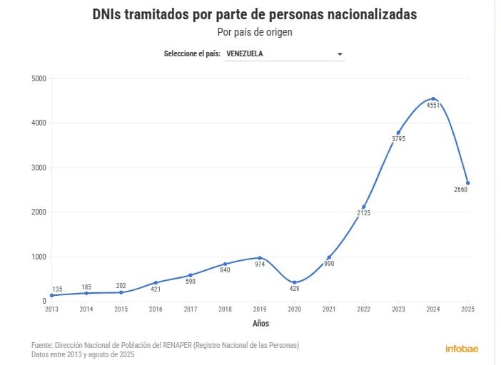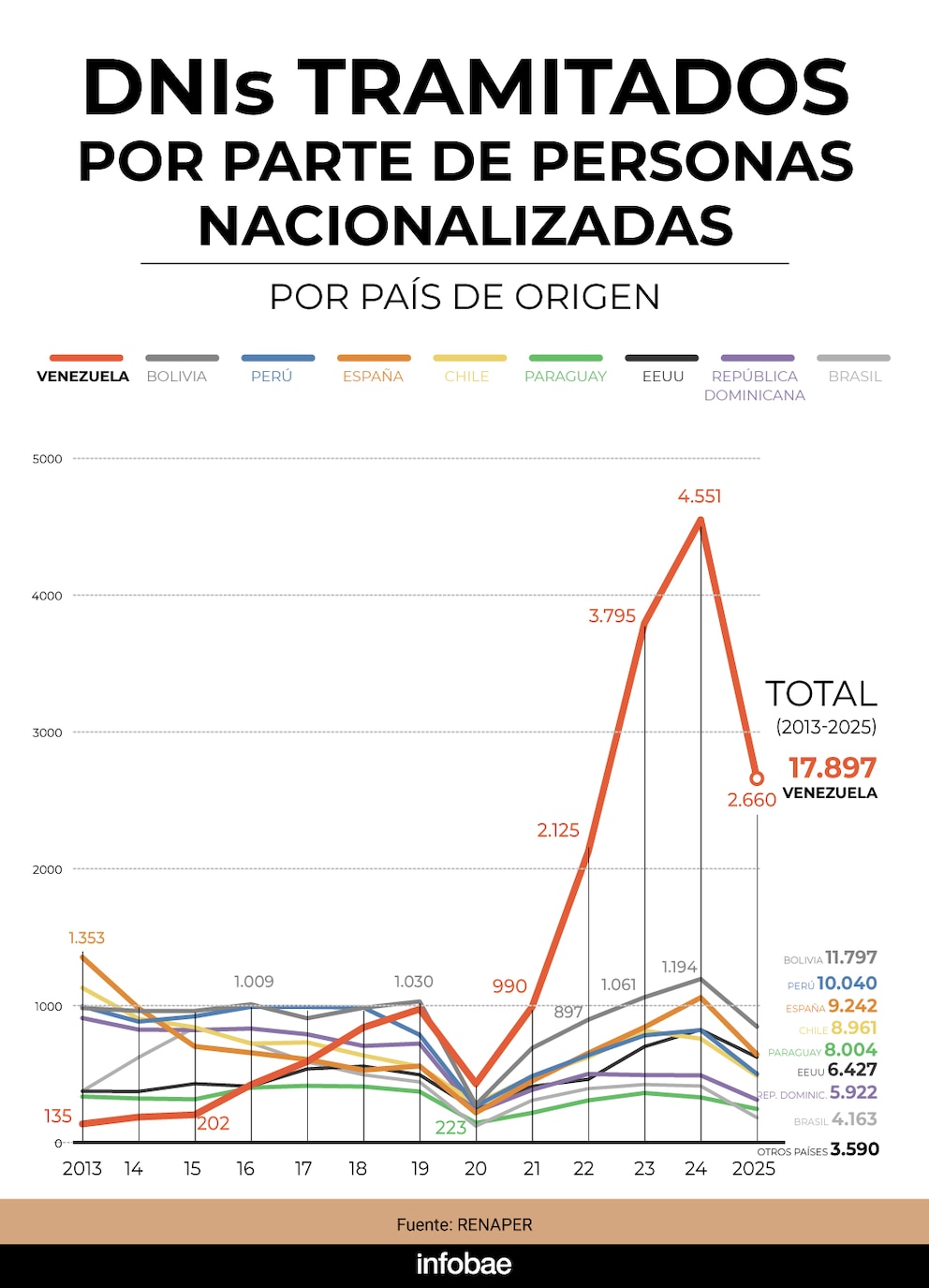 Venezuela, Bolivia y Perú encabezan la lista de países de origen con mayor cantidad de trámites iniciados para la obtención del primer DNI desde 2013. En el caso venezolano, los registros pasaron de apenas 135 trámites en 2013 a 2.125 en 2022, 3.795 en 2023 y 4.551 en 2024. Solo en los primeros ocho meses de 2025 se contabilizaron 2.660 gestiones, lo que eleva el total acumulado a 17.897 DNIs.