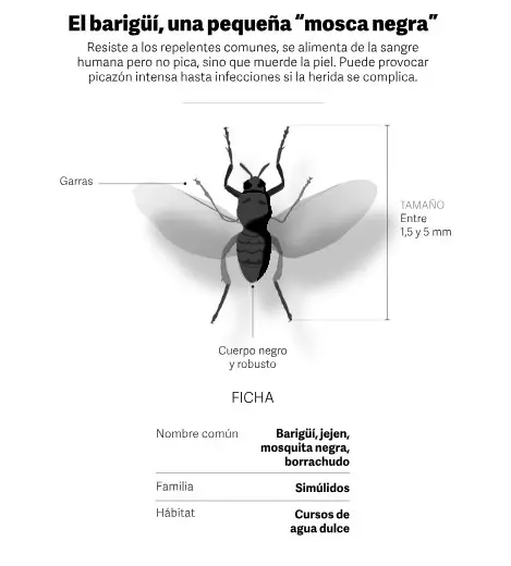 Se trata de un insecto pequeño que habita principalmente en zonas cercanas a corrientes de agua, como ríos y arroyos. A diferencia del mosquito, el barigüí no pica: muerde. Para alimentarse, utiliza pequeñas garras con las que corta la piel y se nutre de la sangre que brota de la herida, lo que genera mayor dolor e irritación.