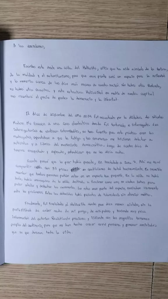 Escribo esto desde una celda del Helicoide, sitio que ha sido símbolo de la tortura, de la maldad y el autoritarismo, pero que muy pronto será un espacio para la reflexión y la memoria acerca de los días más oscuros de nuestra nación. No habrá otra Rotunda, no habrá otra Guasina, y esta estructura helicoidal en medio de nuestra capital nos recordará el precio de perder la democracia y la libertad.