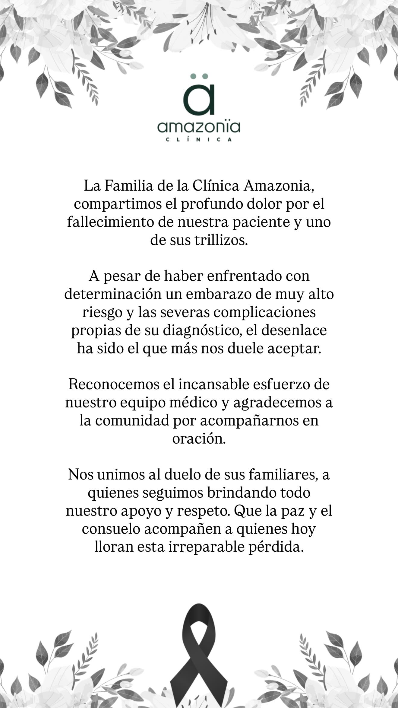 La Clínica Amazonia publicó un comunicado en el que manifestó que «comparte el profundo dolor» por el fallecimiento de la paciente y uno de los trillizos.
