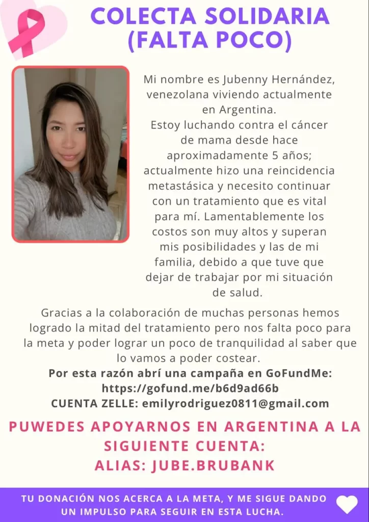 Años más tarde el cáncer hizo una reincidencia metastásica y «necesito continuar con un tratamiento que es vital para mí. Lamentablemente los costos son muy altos y superan mis posibilidades y las de mi familia, debido a que tuve que dejar de trabajar por mi situación de salud», comentó.