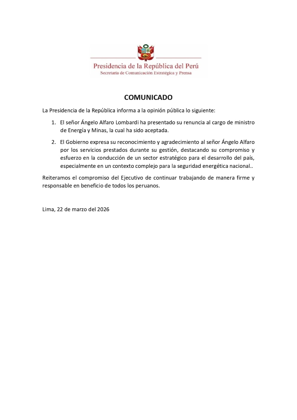 La Presidencia informó, mediante un comunicado, que aceptó su dimisión y agradeció los servicios prestados durante su gestión. Asimismo, destacó “su compromiso y esfuerzo al frente de un sector estratégico para el desarrollo del país, en un contexto difícil para la seguridad energética nacional”.