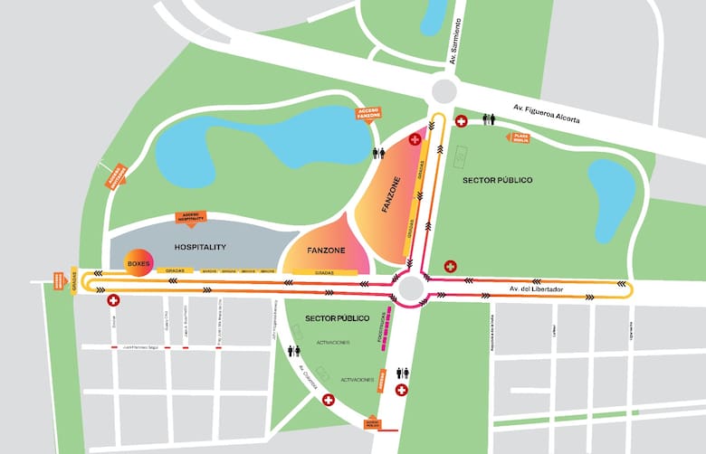 A partir de las 8.30 ya se podrá entrar a los sectores habilitados. Habrá dos grandes escenarios en plaza Seeber y plaza Sicilia con pantallas gigantes, donde se podrán ver las vueltas de Franco desde distintos ángulos, se harán entrevistas al público, habrá DJs y se presentará la Orquesta Sinfónica de la Ciudad, desde las 11. Tanto en las plazas Sicilia como Seeber no va estar permitido acampar. Y en la zona estará prohibida la venta ambulante.